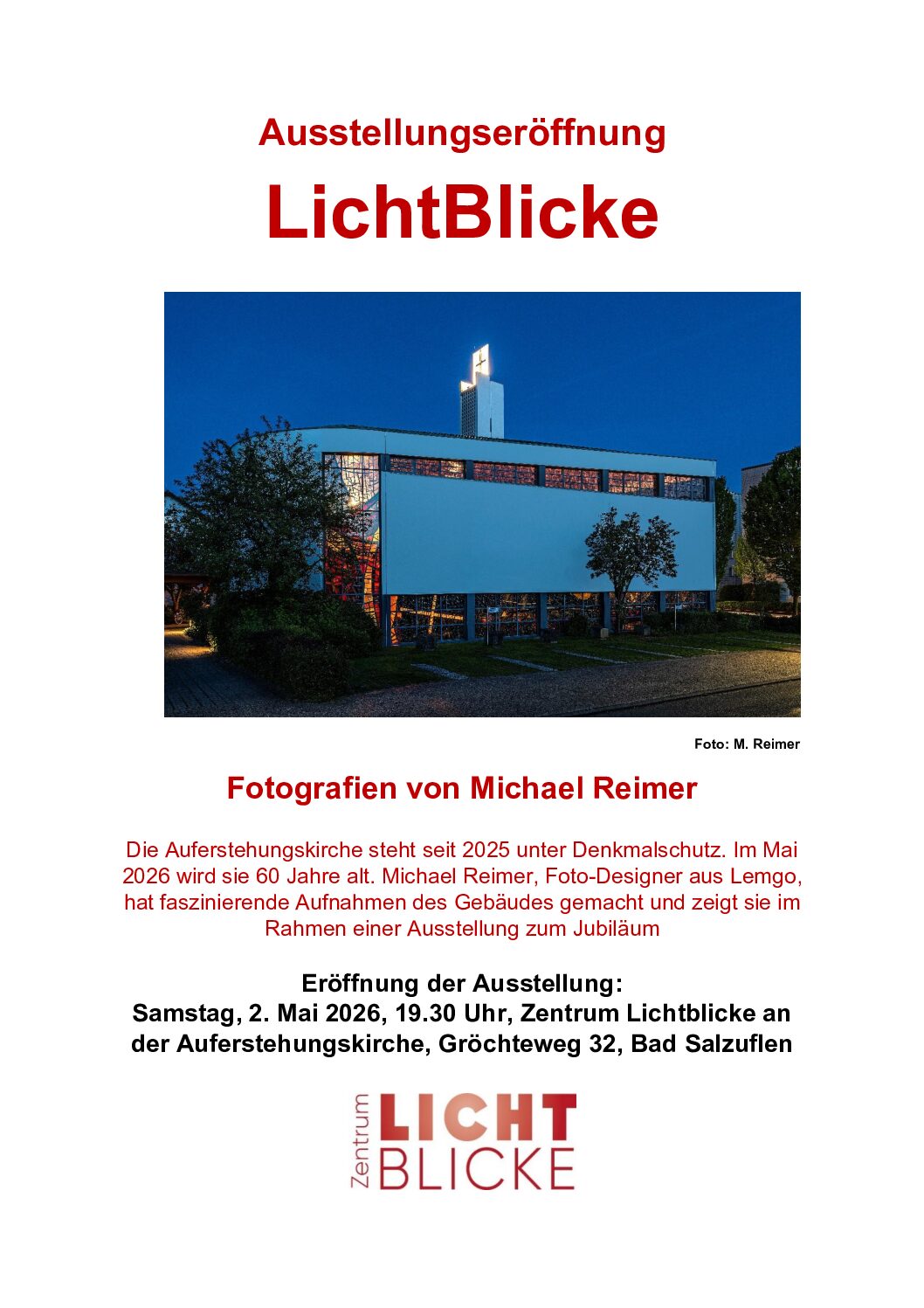 Das soll gefeiert werden! Am 1. Mai 1966 wurde die Kirche eingeweiht. Am 2. Mai 2026 feiern wir das Jubiläum mit einem beschwingten Bläserkonzert mit den BrassBrothers in bester Posaunenchortradition. Anschließend wird im Zentrum Lichtblicke die Ausstellung LichtBlicke mit Fotos von Michael Reimer, Lemgo, eröffnet. Im Auftrag der Unteren Denkmalbehörde hat er die Auferstehungskirche aus ungewohnten Perspektiven fotografiert. Und natürlich stoßen wir auf das Jubiläum an! Herzlich willkommen!